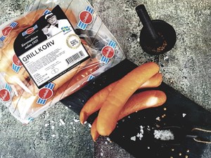 Griskött 56%, vatten, fett fläsk, potatismjöl, socker,