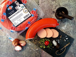 Gris- & nötkött 56%, vatten, fett fläsk, potatismjöl, socker,