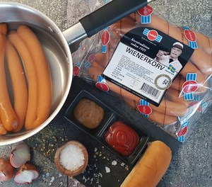 Gris- & nötkött 64%, vatten, fett fläsk, potatismjöl,